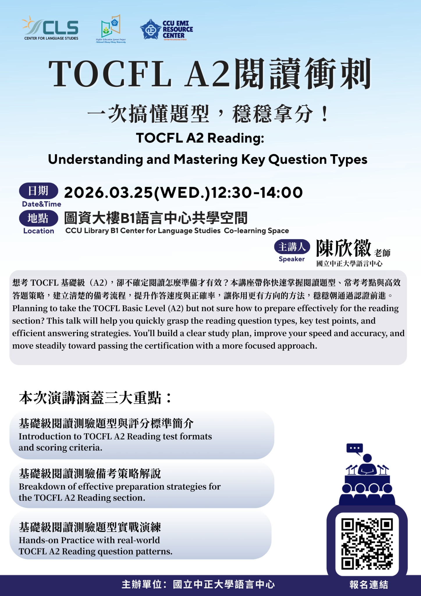Don't worry! CCU Center for Language Studies has invited Instructor Chen Xin-Hui to help you master key question types and efficient answering strategies! 🚀